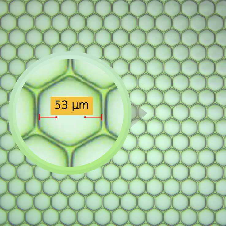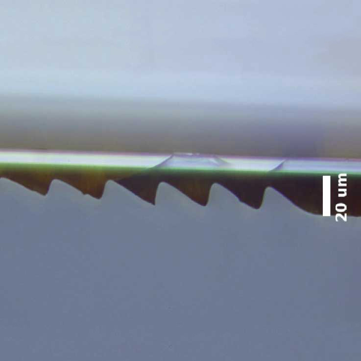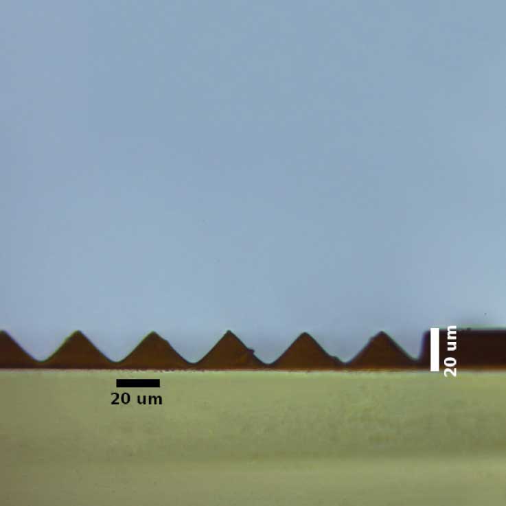 Cross-section of a surface with pyramidal structures used as an optical diffuser.